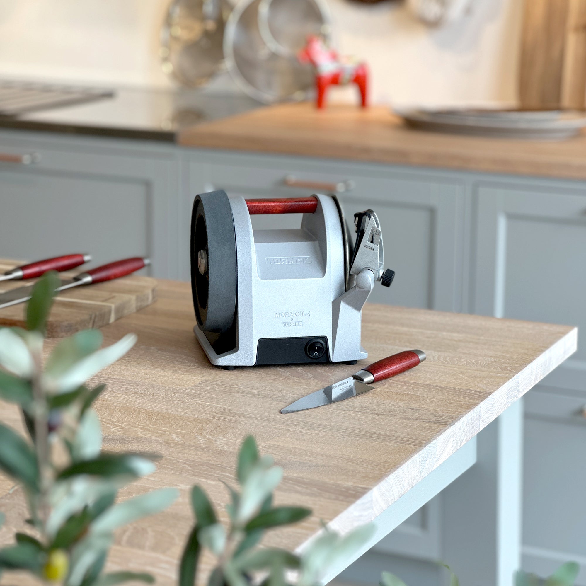 The Tormek T-1 Kitchen Knife Sharpener is developed and produced in Sweden. Its compact design fits all kitchen counters. The long lasting sharpener comes with 5+3 warranty and is maintenance-free